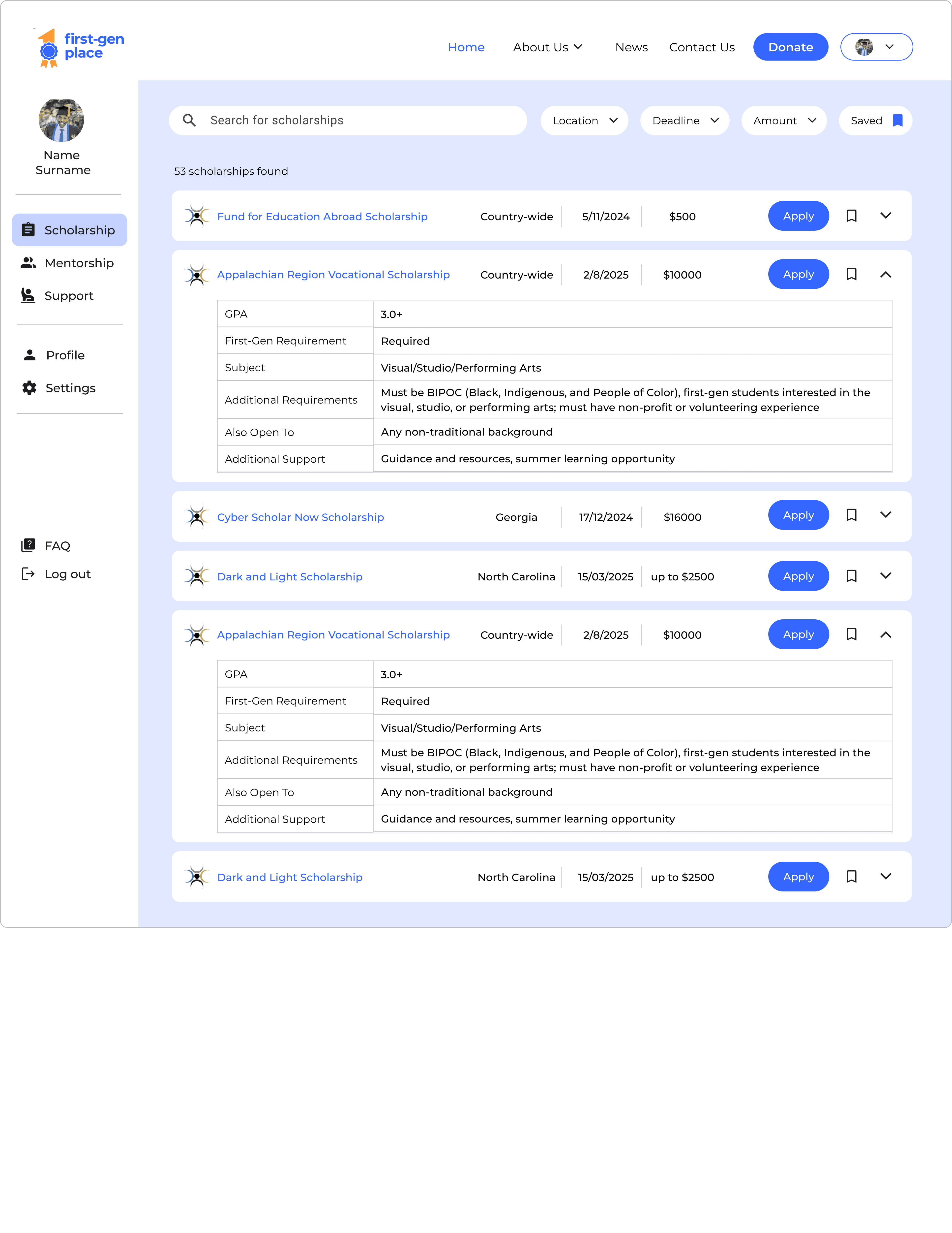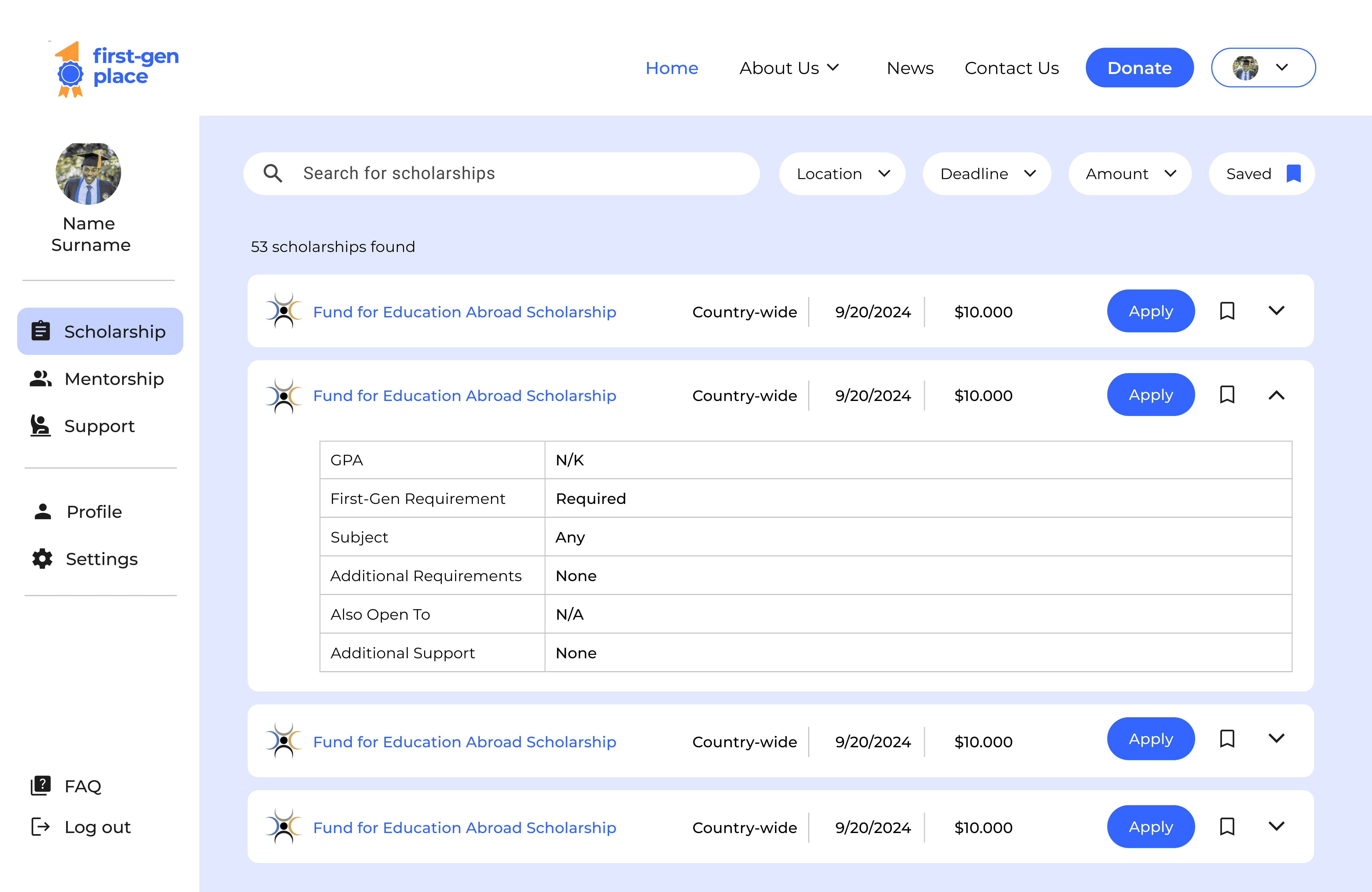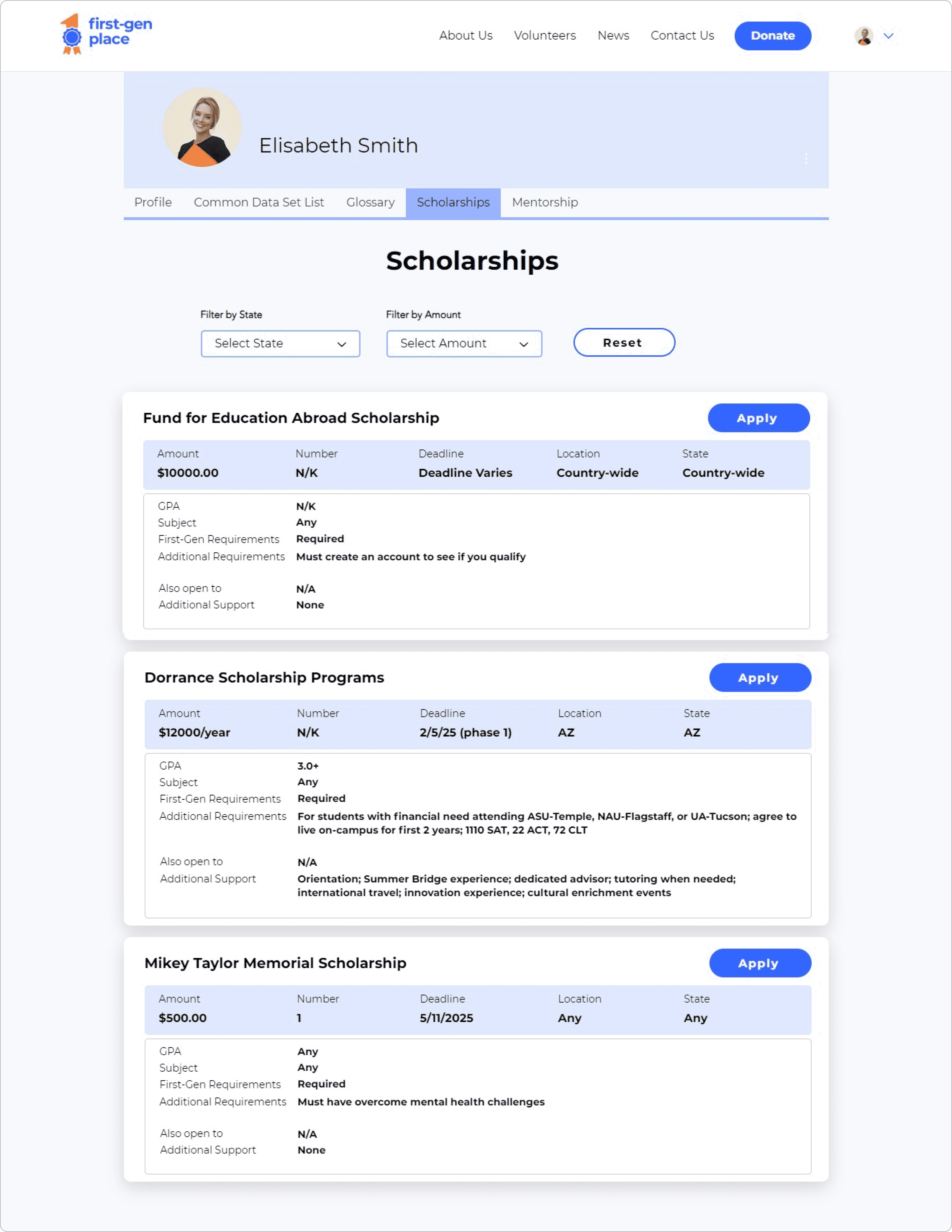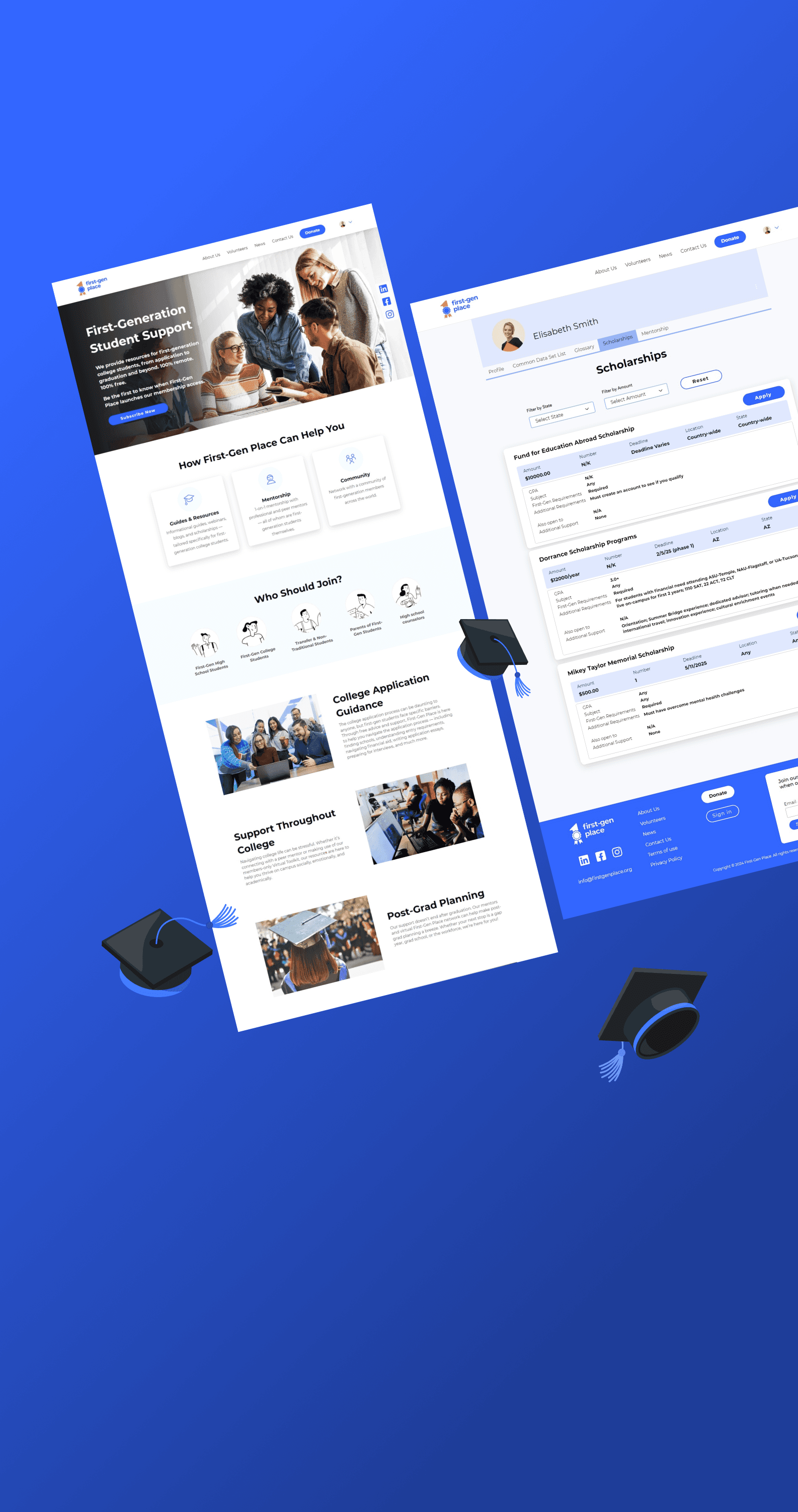 Create a members area on the existing First-Gen Place website where users can view relevant scholarship information and select the best options for themselves. Include a list of verified mentors with relevant information and provide a way for users to contact them whenever they need advice.