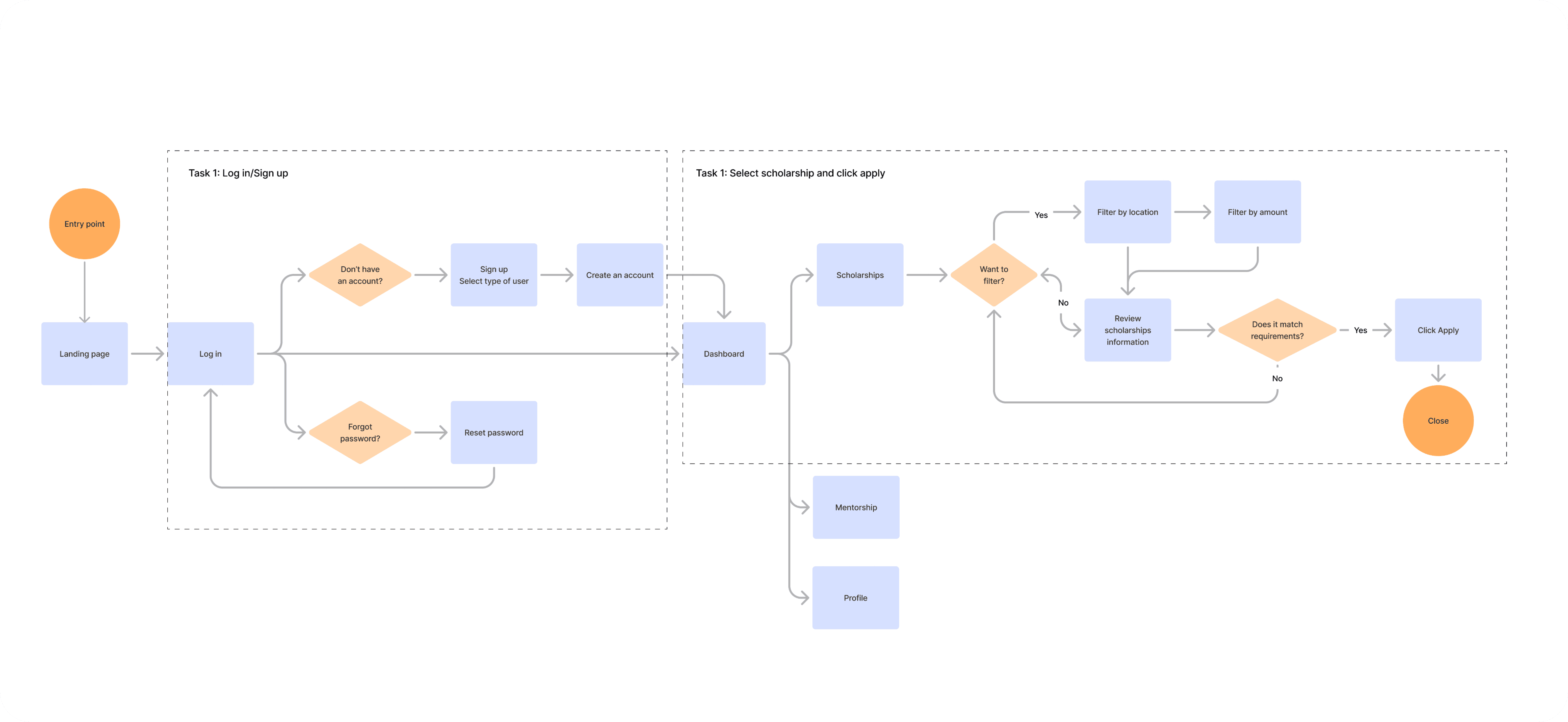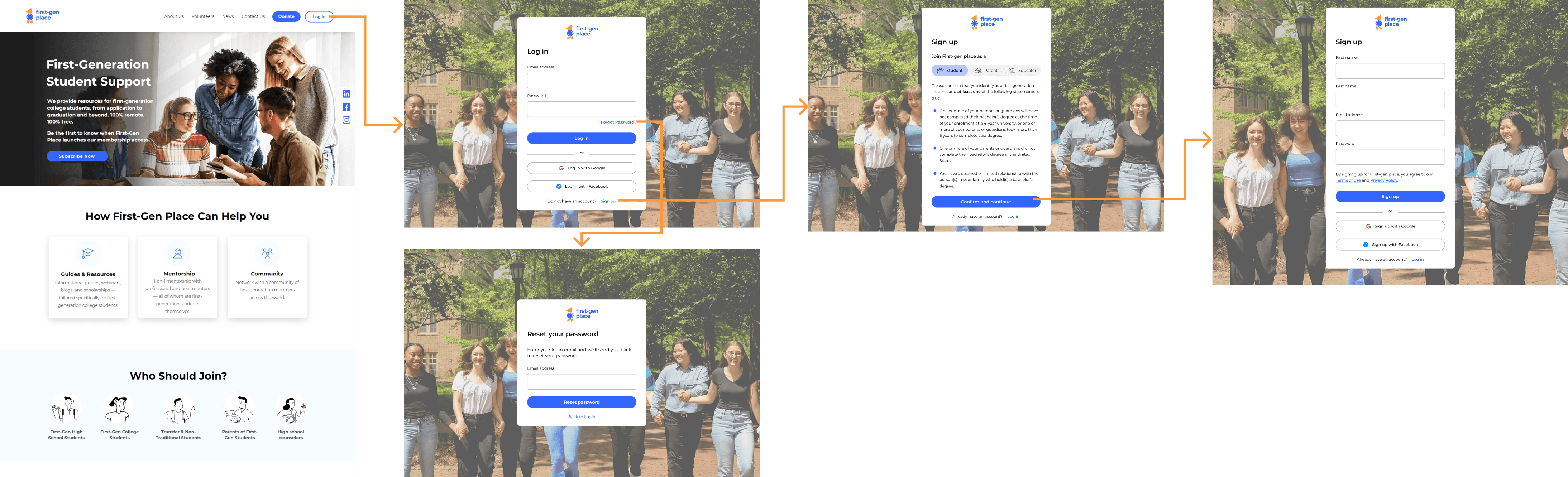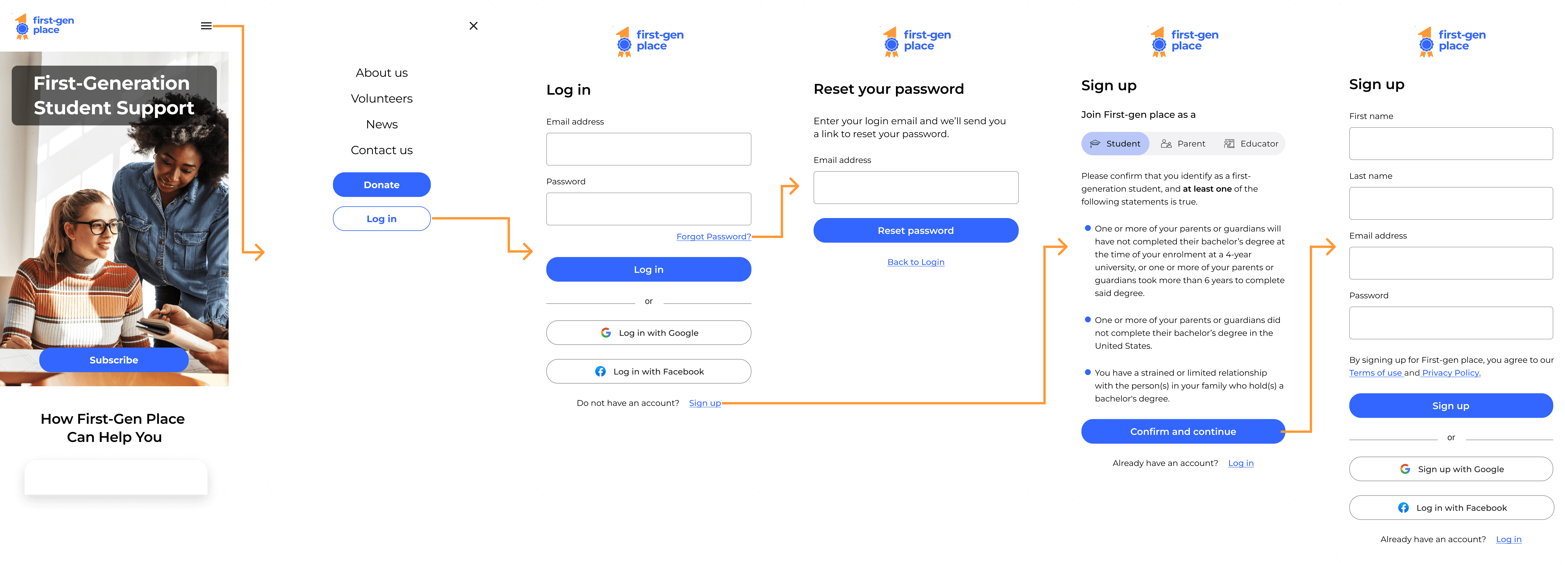 Following the user needs and First-Gen Place requirements I created user flows which helped me define the necessary features and functions needed for each step in the journey.