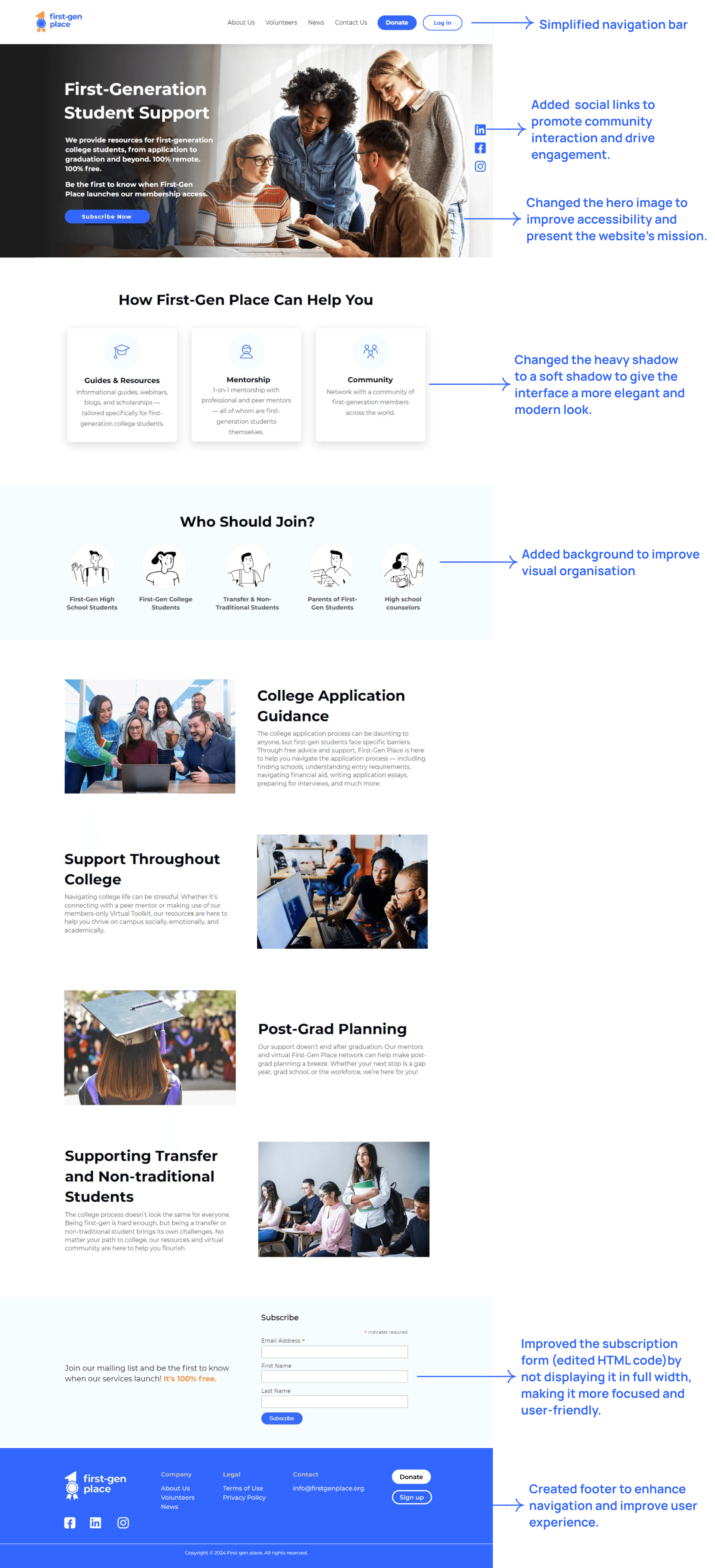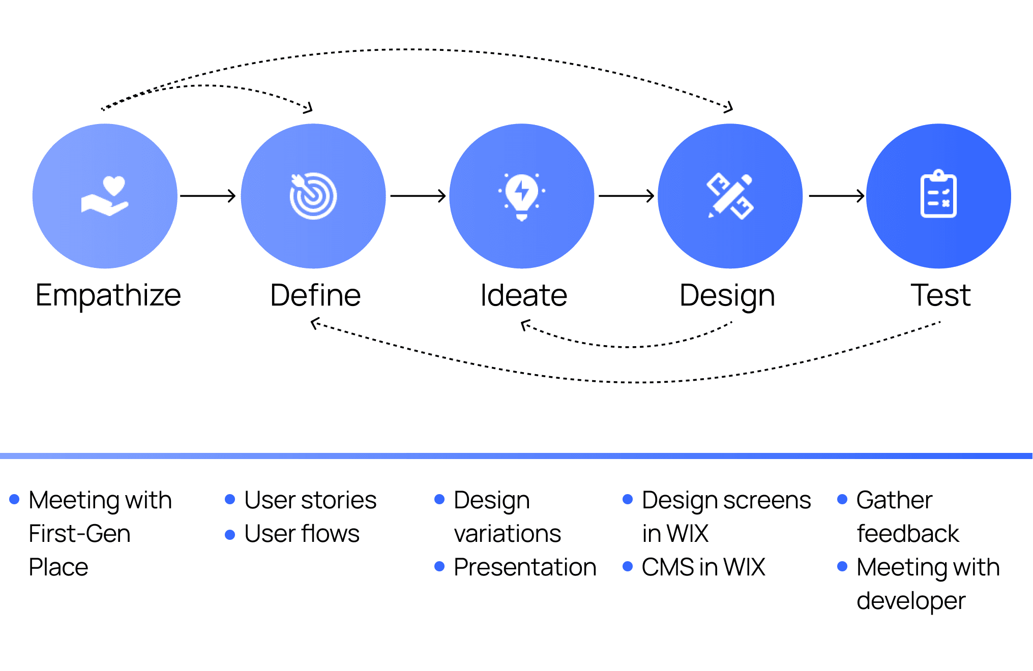 I began my process with a kickoff meeting involving the stakeholders and the designer of the First-Gen Place website. This meeting helped me gain a better understanding of the users' and the organization's needs. The CEO also highlighted key goals to effectively support students, their parents, and educators.