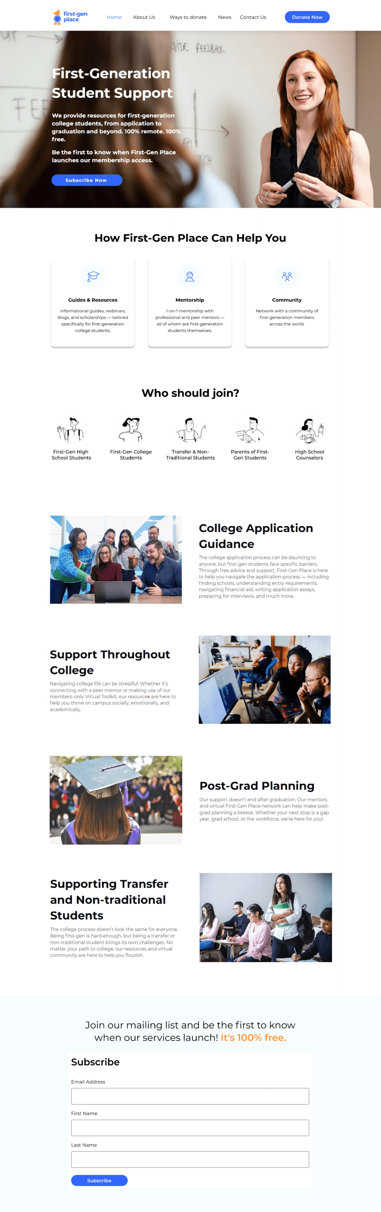 First-Gen Place is a non-profit organisation that creates a virtual safe space for first-generation students. The goal is to help students through any challenges they might face in college because of the first-generation status: particularly, applying to college, working towards a degree, and looking for the first job.