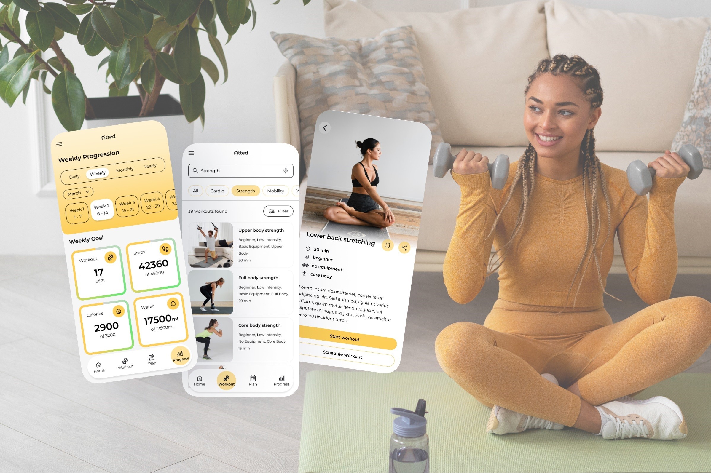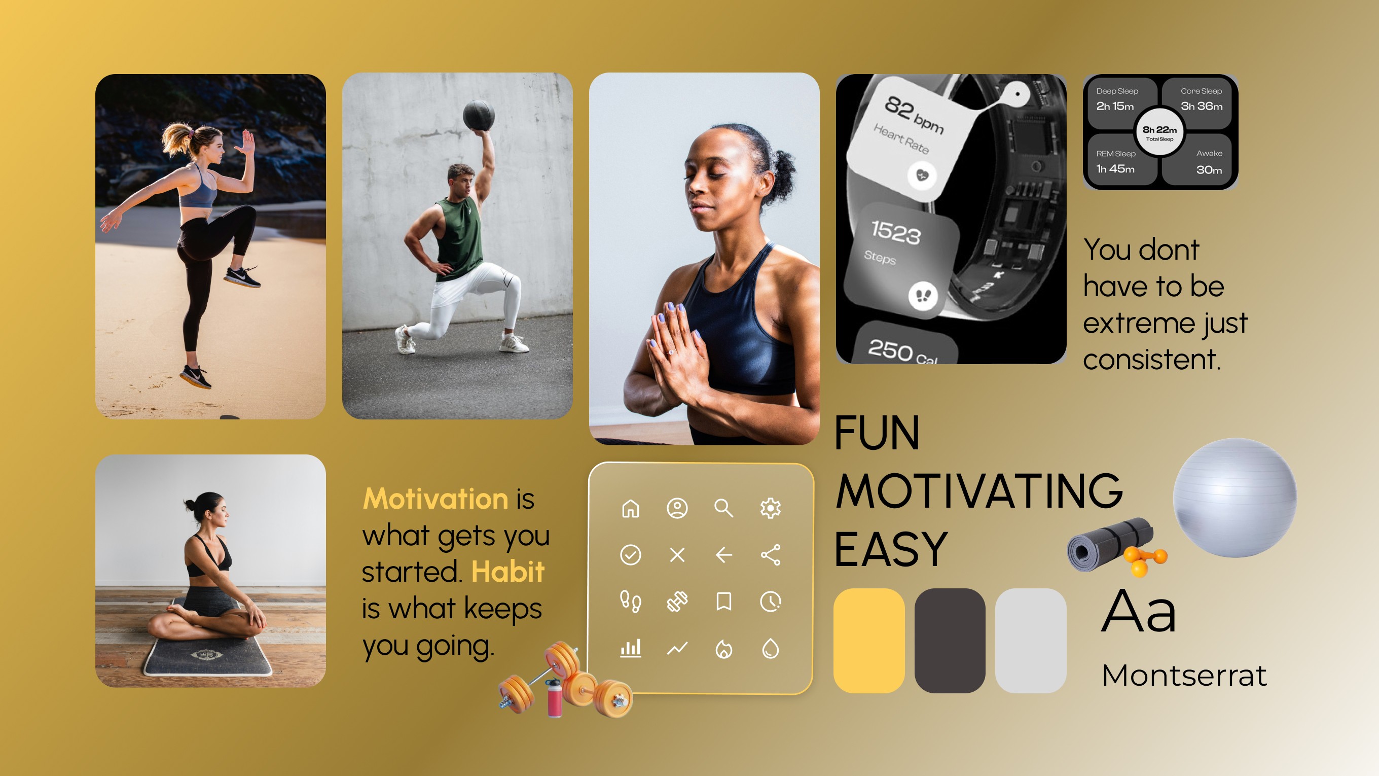 When focusing on app style, I created a moodboard for a fitness app aimed at busy individuals. It features an energetic, professional colour scheme to keep users motivated and enjoying their workouts. The style is modern and easy to navigate, with images that inspire action and show how fitness can fit seamlessly into their schedules.
